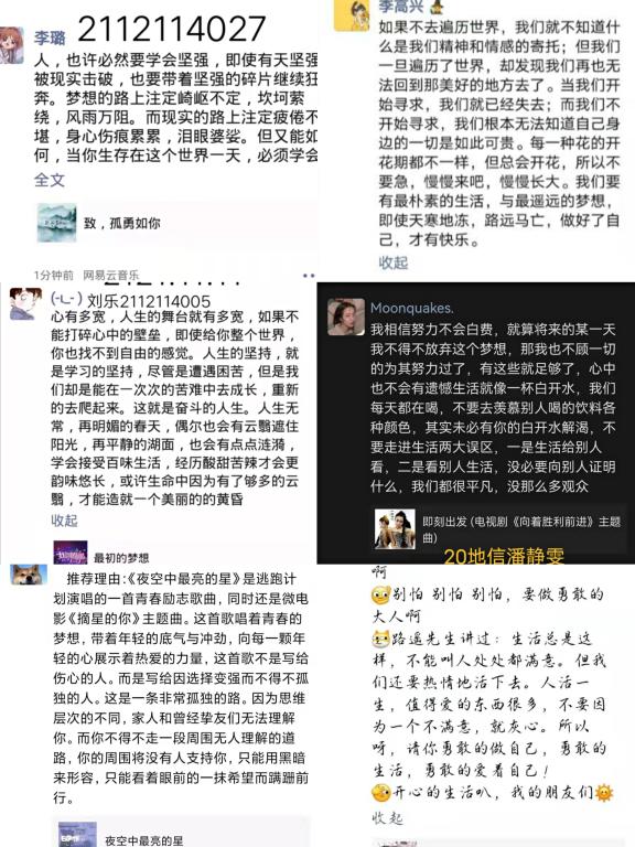 本次活动共吸引到全院近百余名学生参与其中,通过每日线上听歌打卡的形式,为学生在疫情防控封闭管理期间舒缓压力、调节情绪、保持良好的心理健康状态提供了有效途径。活动上线7天以来,全院学生累积打卡近700次,打卡方式主要集中在微信朋友圈分享、手写歌曲热评。期间,参与选手们按时完成打卡任务,积极交流听歌感悟,向他人推荐了自己所喜爱的音乐及理由,不仅使自身的心情得到了充分放松,负面情绪也得到了有效化解。